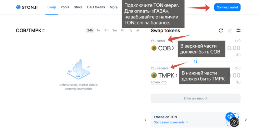 - Механизм Вывода: Обратный обмен токенов TMPK осуществляется через DeFi платформу Ston.fi, повторяя тот же механизм, что и при первичном обмене токенов COB на данный токен.